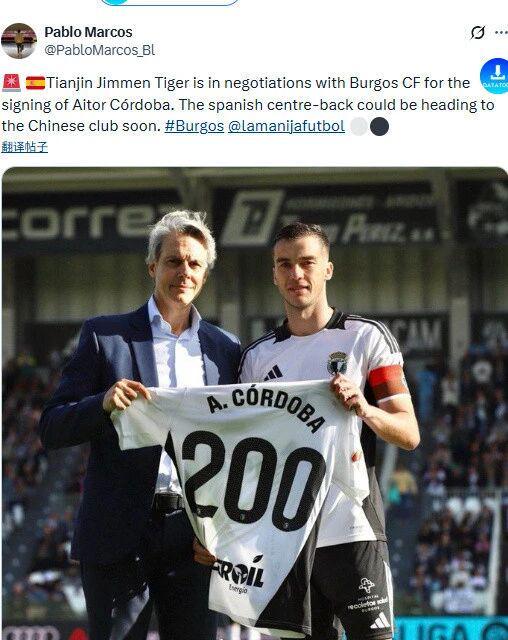 据报道,天津津门虎已经与西乙球队布尔戈斯就埃托尔-科尔多瓦的转会达成协议,科尔多瓦将加盟天津津门虎。布尔戈斯主教练拉米斯在接受采访时表示,科尔多瓦将不再随队前往客场,他的离队手续几近完成,双方俱乐部正在做最后的工作。